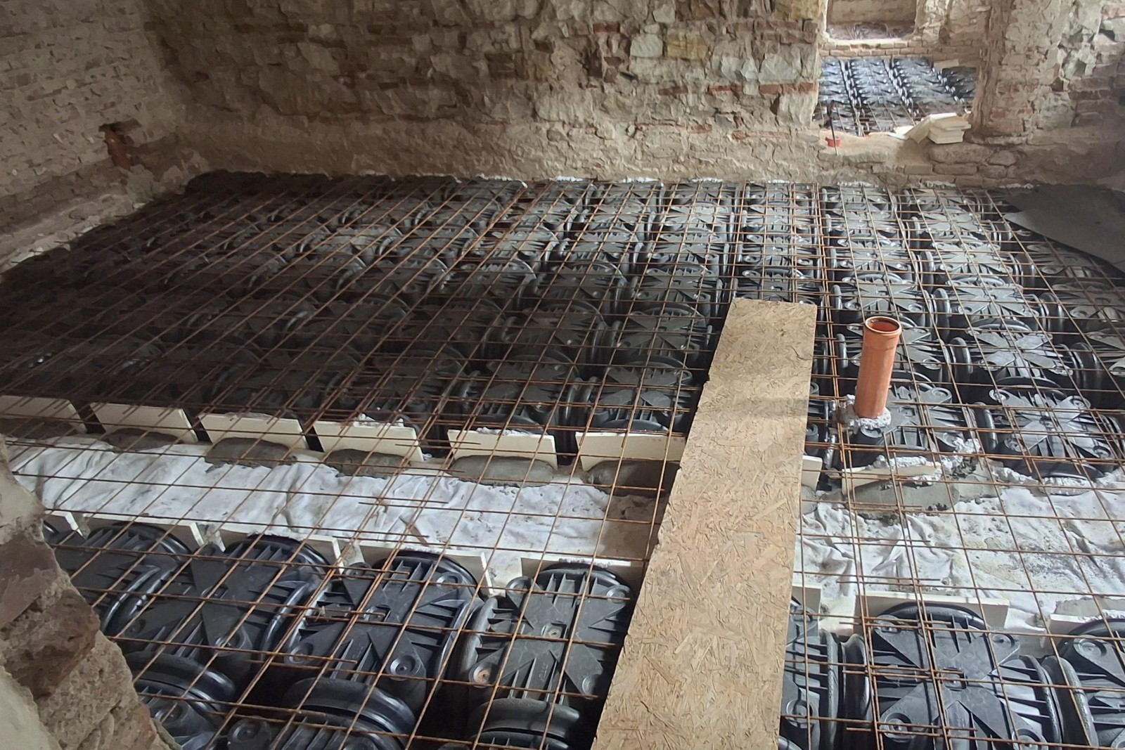 Je provedeno odvětrání podlah systémem IGLU včetně zabetonování desky.