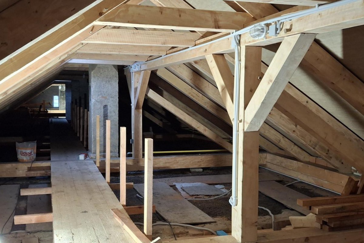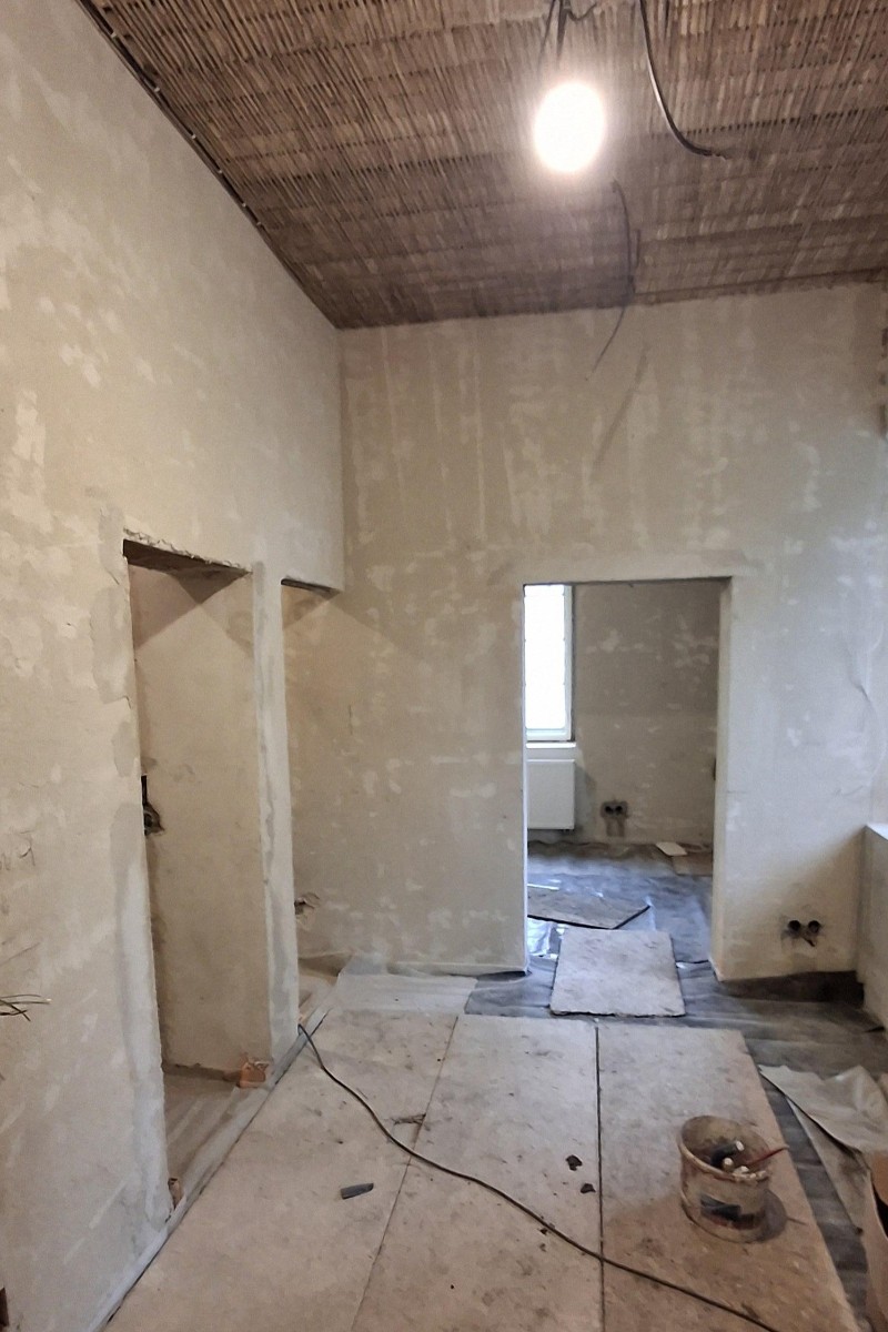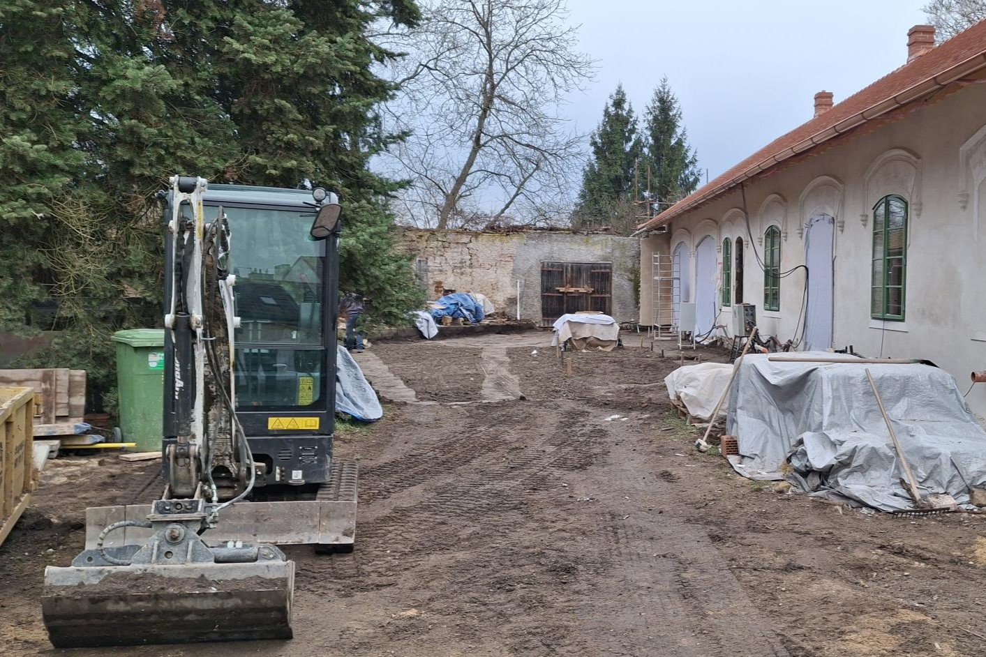 Stavební práce pokračují v interiéru a zahájeny byly také výkopové práce pro přípojky a kanalizaci.