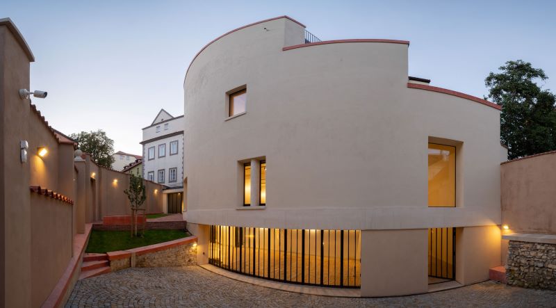 Interiér stavby: Výjimečnost domu samotného i specifičnost místa podtrhuje i koncepce interiéru. Uspořádání dispozice zohledňuje požadavky majitele domu i skloubení veřejné a soukromé funkce a současně si hraje s výhledy na architektonické dominanty Malé Strany. Osobitost interiéru podtrhuje řada nábytkových kusů a dalších prvků vyráběných na míru. Namátkou jmenujme například obloukovou knihovnu z masivního dřeva (dubová spárovka), zakřivené schodiště s elitpickým zrcadlem, jehož plná hmota kontrastuje se subtilním zábradlím z ocelových prutů, nebo ocelový nábytek či krbovou vložku s povrchem upraveným technikou brynýrování.