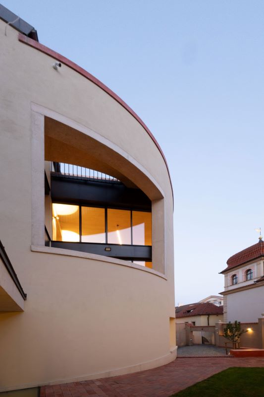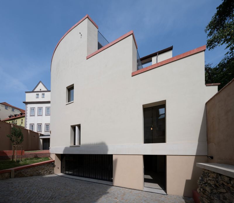 Význam stavby: Téma novostavby v historickém prostředí je vždy složité a při hledání ideální koncepce je nutné zohlednit velké množství faktorů. Bytový dům s galerií snoubí aktuální technické a funkční požadavky a současně reaguje moderními výrazovými prostředky na specifičnost prostředí Malé Strany. Za zmínku stojí například probarvené betony v červeném odstínu, které se uplatňují v korunách zídek a atik teras jako parafráze k pálené střešní krytině.