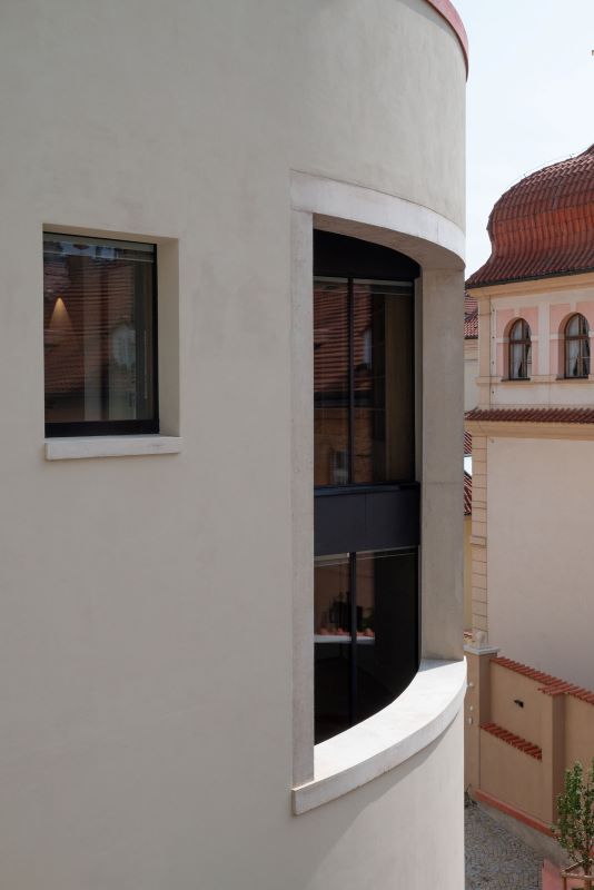 Architektonické řešení: Od počátečních návrhů se do hmotového i dispozičního řešení jednotlivých podlaží propisovala koncepce sledování linie ohradní zdi v podobě zaobleného půdorysu na jižní a západní straně. Na severní hraně pozemku je pak umístěno nejvyšší ustoupené podlaží zakončené pultovou střechou. Z tohoto nejvyššího bodu pak hmota domu kaskádovitě klesá prostřednictvím teras a přirozeně tak kopíruje klesání nivelety ulice Tržiště.