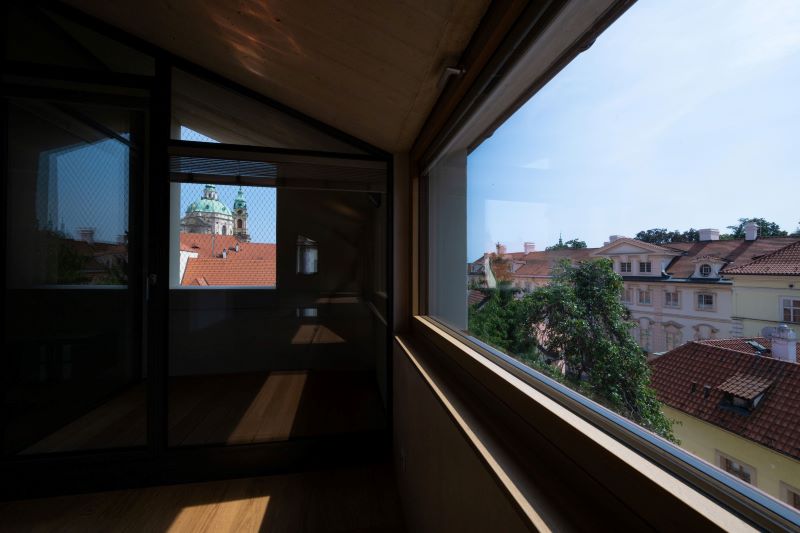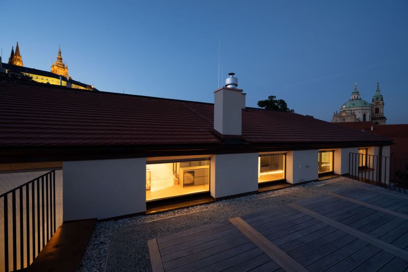 Svislé nosné konstrukce jsou provedeny jako zděné, stropy jsou z monolitického betonu. Stavba je v místě nad obytným podkrovím (mezipatrem) zastřešena pultovou střechou s pálenou střešní krytinou z bobrovek kladených ve dvojitém krytí, ostatní zastřešení jsou řešena v podobě plochých střech, které jsou z větší části řešené jako pochozí terasy. Tradiční krytina z bobrovek byla volena v souladu s tradičním materiálovým řešením okolní zástavby, aby byla zachována střešní krajina této historické části Prahy.