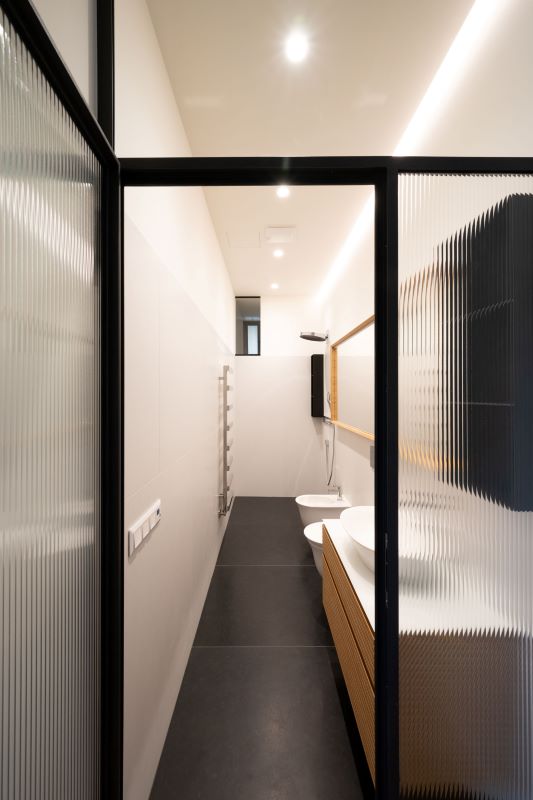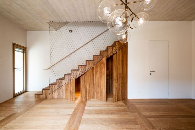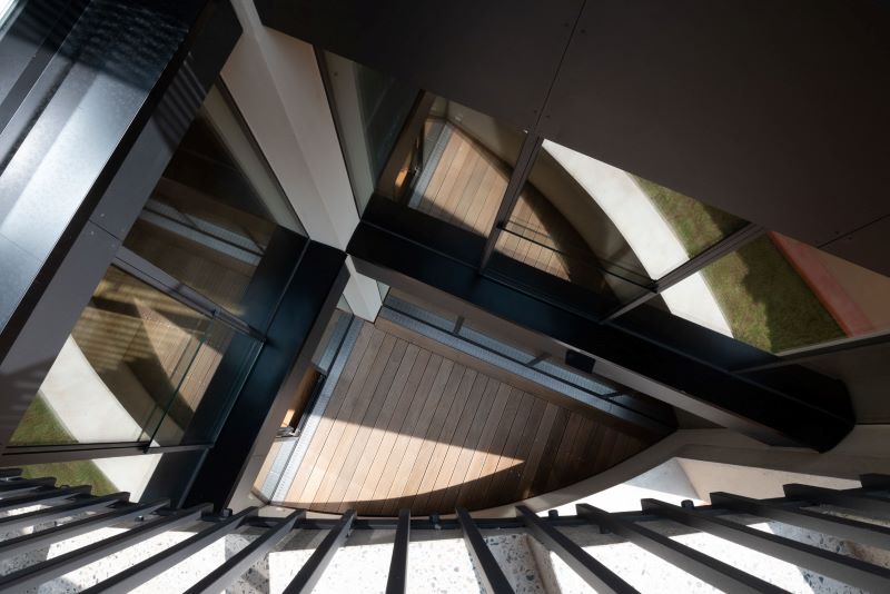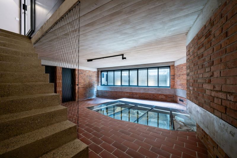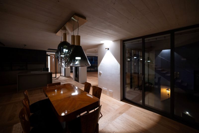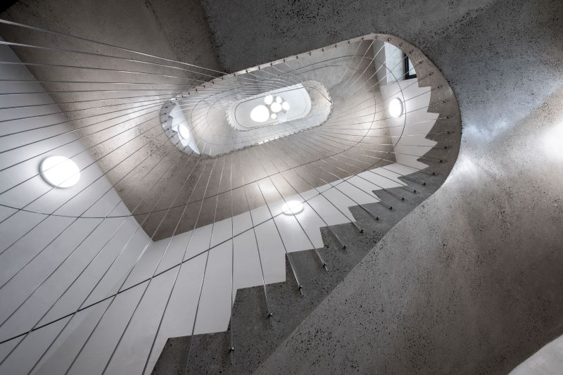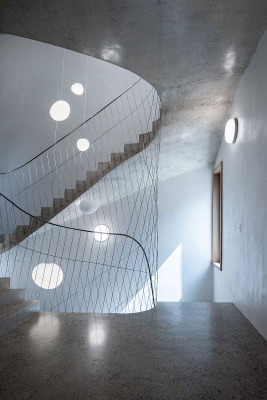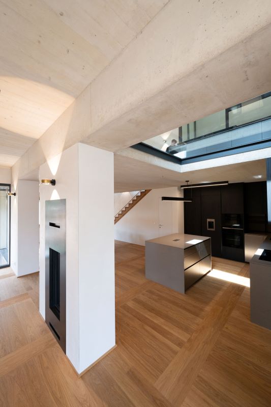 Jistou decentní hru můžeme spatřovat v harmonickém kontrastu použitých materiálů. Nepřehlédnutelný vizuální prvek interiéru představují stropy z bílého pohledového betonu, jejichž surový povrch s otiskem nehoblovaných prken tvoří protiklad k pocitově hřejivým dubovým podlahám. Materiálovou škálu dále doplňují kletované štukové povrchy nebo plochy velkoformátového zasklení.