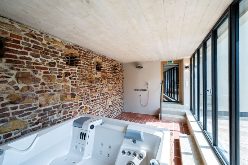 V severním vnitřním traktu bytu ve 2. patře je umístěno vestavěné mezipatro využívající prostor krovu pod pultovou střechou jako ložnici přístupnou přes obytnou halu. Mezipatro je opticky propojeno s nižším podlažím bytu prostřednictvím otvoru ve stropní konstrukci v místě kuchyně, který je kryt pochozím sklem. Tento prvek zajišťuje sekundární přístup denního světla do prostoru kuchyňského koutu umístěného v hloubce půdorysu a současně opticky tento prostor se sníženým stropem provzdušňuje a zároveň posiluje dojem vložené stropní desky pod mezipatrem. Při opačném pohledu shora dolů lze sledovat z prostoru ložnice oheň v krbu obývacího pokoje. Z většího bytu je pak dále přístupný whirlpool umístěný v proskleném respiriu na střeše vstupní haly galerie. Podélná zadní stěna v respiriu je původní, a to ze smíšeného kamenného cihelného zdiva.